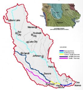 The Raccoon River rises in central Iowa, an area of exceptional agricultural productivity, especially corn, soybeans, and hogs. The agricultural activity contributes large quantities of nutrient pollution to the river. This agricultural nutrient pollution has long been the focus of controversy, particularly because the city of Des Moines uses the Raccoon River as a source of drinking water.